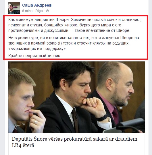 Otrdien kļuva zināms, ka deputāts Edvīns Šnore (NA) uzrakstījis iesniegumu ģenerālprokuroram, lūdzot izvērtēt Latvijas Radio 4 izskanējušo aicinājumu noslepkavot tos 12 000 Latvijas iedzīvotājus, kuri ManaBalss.lv portālā parakstījušies zem iniciatīvas par Uzvaras laukuma Rīgā atjaunošanu tā vēsturiskajā veidolā. Uz Šnores rīcību asi reaģējis Latvijas Radio 4 žurnālists Aleksandrs Andrejevs, kurš deputātu nodēvējis par psihopātu un nodevēju, kas baidās no dzīves un atsakās redzēt pasauli ar visam tās pretrunām un diskusijām.