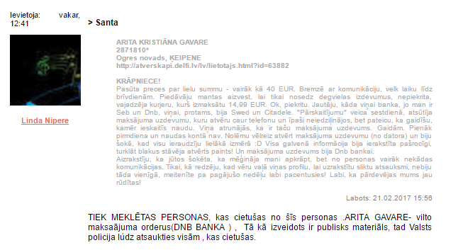Nav zināms, vai krāpnieci tiešām sauc Arita Signe Girteve (kā bija norādīts viņas facebook.com profilā) un vai fotogrāfijā redzamā sieviete vispār eksistē, bet DNB bankas pārstāvis Jānis Dambergs apstiprina, ka maksājums ir viltots. Bankas pārstāvis iesaka vienmēr sagaidīt, kad maksājums izpildīts un tikai tad sūtīt paku. Turklāt norēķini starp Latvijas bankām tiek veikti vairākas reizes dienā.