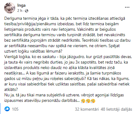 “Derīguma termiņa jēga ir tāda, ka pēc termiņa iztecēšanas attiecīgā tiesība/privilēģija/pienākums izbeidzas, bet līdz termiņa beigām lietojamais produkts vairs nav lietojams. Vakcinēts ar beigušos sertifikāta derīguma termiņu varēs turpināt strādāt, bet nevakcinēts bez sertifikāta joprojām strādāt nedrīkstēs. Teorētiski tiesības uz darbu ar sertifikāta neesamību nav spēkā ne vieniem, ne otriem. Spējat uztvert loģiku valdības lēmumā? Vienīgā loģika, ko es saskatu – bija jāizgudro, kur grūst pasūtītās devas, ja tauta ceturto reizi vairs negribēs durties, jo jau trīs reizes sapotēts, bet redz taču, ka izslavētais produkts neko daudz no aļika klāsta kvalitātes ziņā neatšķiras…”